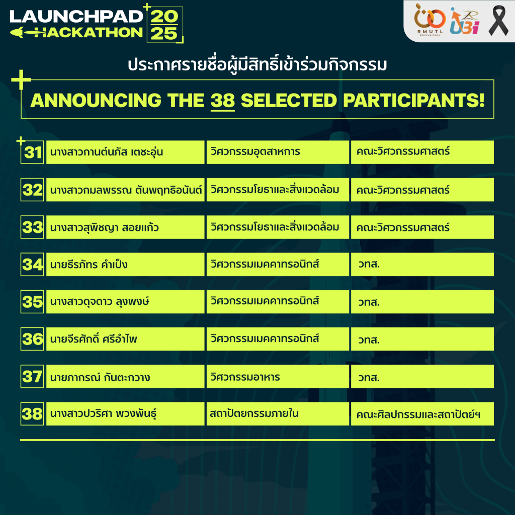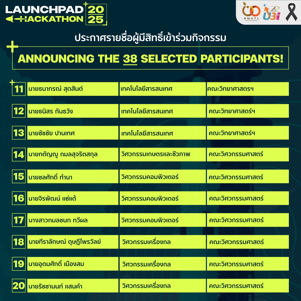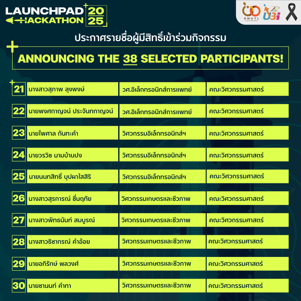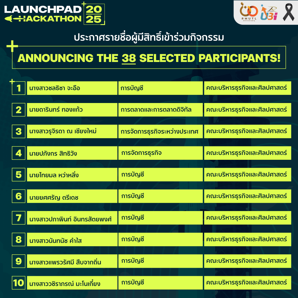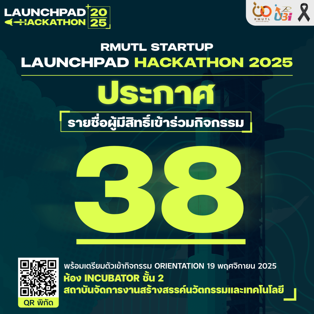 ประกาศรายชื่อผู้ผ่านการคัดเลือกเข้าร่วมกิจกรรม RMUTL Startup Launchpad Hackathon 2025